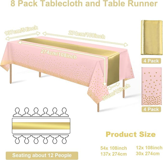 8Pack Disposable Plastic Tablecloths and Satin Table Runner Set Pink and Gold Dot Tablecloth Gold Satin Table Runner for Wedding Birthday Baby Shower Anniversary Christmas New Year Party Supplies