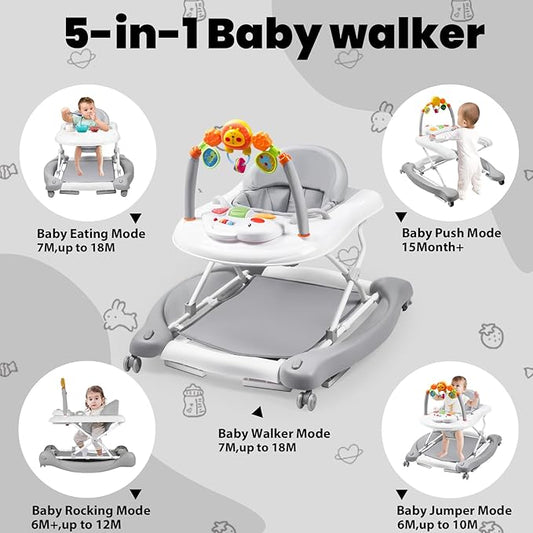 Baby Walker, 5-in-1 Baby Walkers for Boys and Girls 6-12 Months with Bouncer, Removable Footrest, Feeding Tray & Music, Foldable & Adjustable Activity Walker for 6-18 Months Toddler Infant