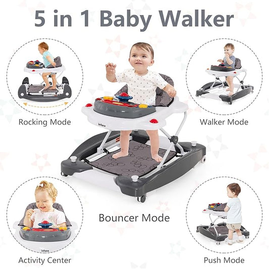 INFANS Baby Walker, 5 in 1 Behind Walker Learning Seated Rocker Bouncer with Removable Music Tray, Adjustable Height, Washable Seat Cushion, Foldable Activity Center for Toddlers (Grey)