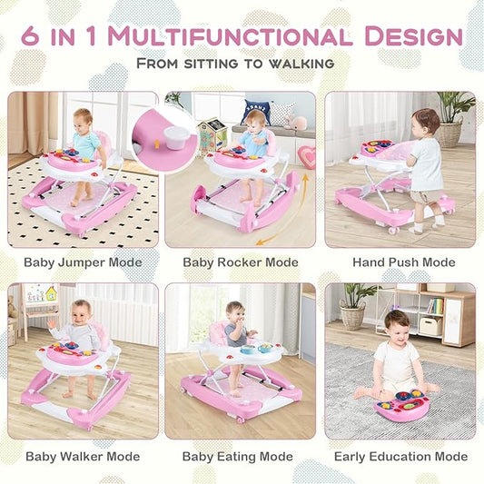 BABY JOY 6-in-1 Baby Walker, Foldable Baby Walker with Wheels, Adjustable Height, Music, Lights, Bouncer & Rocker Mode, Baby Walkers for Boys Girls 6-14 Months (Pink)