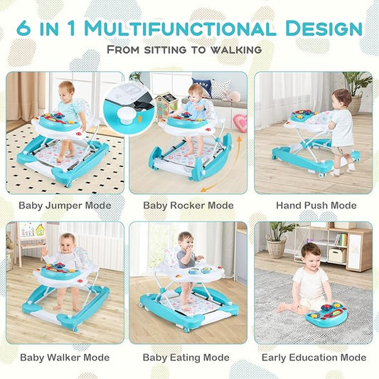 BABY JOY 6-in-1 Baby Walker, Foldable Baby Walker with Wheels, Adjustable Height, Music, Lights, Bouncer & Rocker Mode, Baby Walkers for Boys Girls 6-14 Months (Blue)