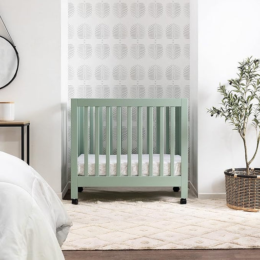 Babyletto Origami Mini Portable Crib Folding with Wheels in Light Sage, 2 Adjustable Mattress Positions, Greenguard Gold Certified