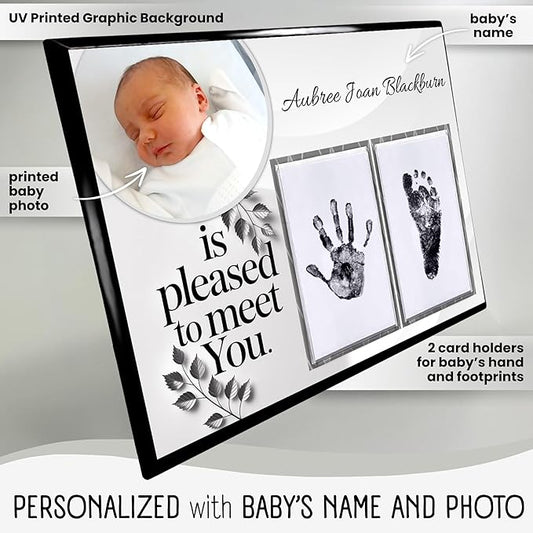 Baby Hand and Footprint Kit with Photo & Birth Details, Inkless Hand and Footprint Kit, Newborn Keepsake Plaque, Baby Shower Gifts (STYLE 1 (Fully Personalized) (Is Pleased To Meet You))