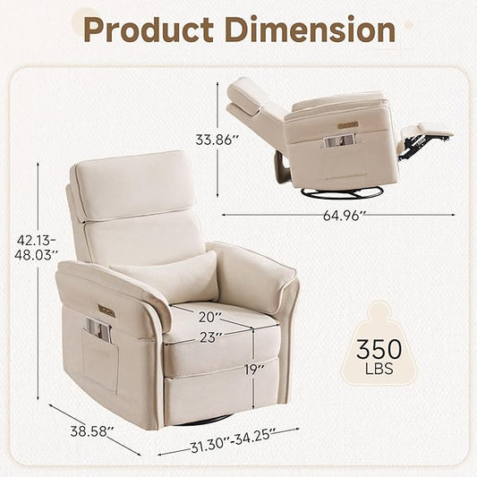 Power Recliner Swivel Rocking Glider, Upholstered Electric Rocking Adult Recliner with USB Port,Nursery Rocking Chair with 2 Pillows Living Room Bedroom (White, Power-Driven)
