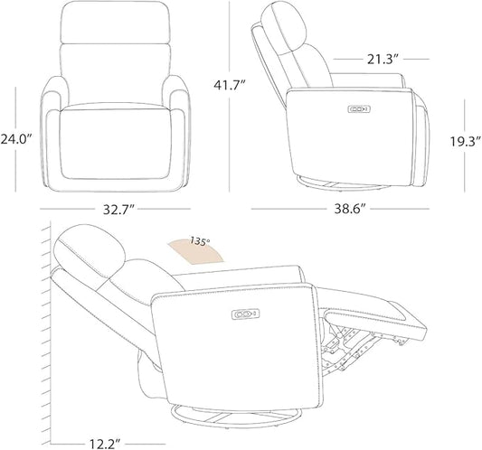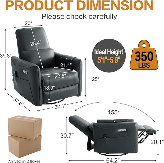 Genuine Leather Modern Electric Swivel Glider Power Recliner Chair with USB and Type-C Ports for Living Room, Power Lift Function, Grey