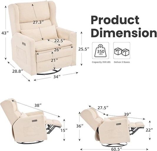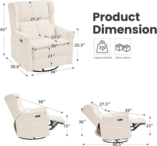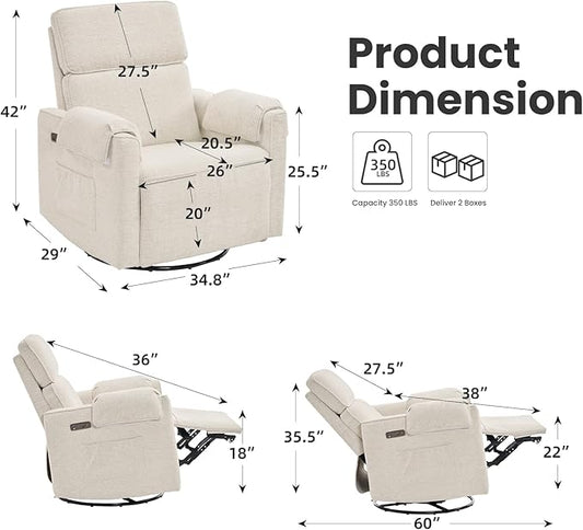 CHITA Electronic Power Recliner Chair Swivel Glider, FSC Certified Modern Nursery Rocking Chair with USB and Type-C Ports, Ivory
