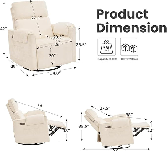 Power Recliner Chair Swivel Glider, Electric Rocking Recliner Chairs with USB and Type-C Ports, Nursery Chair Recliner for Living Room, Bedroom, Apartment(White)