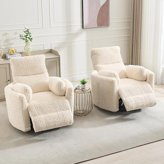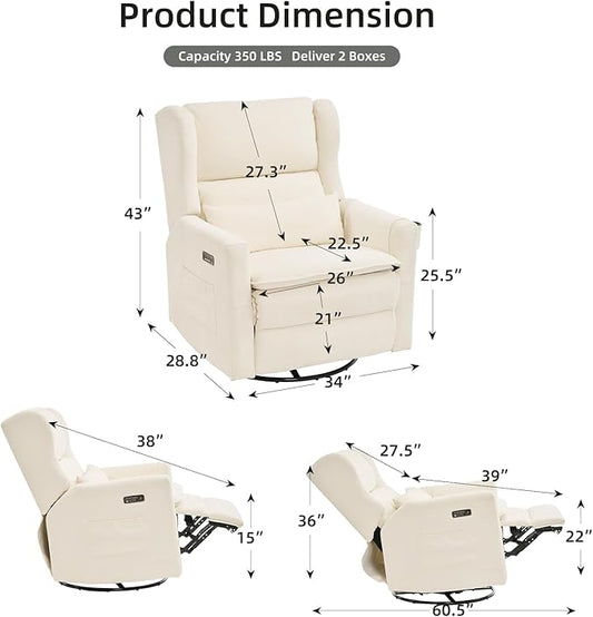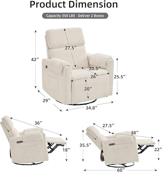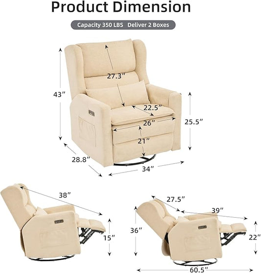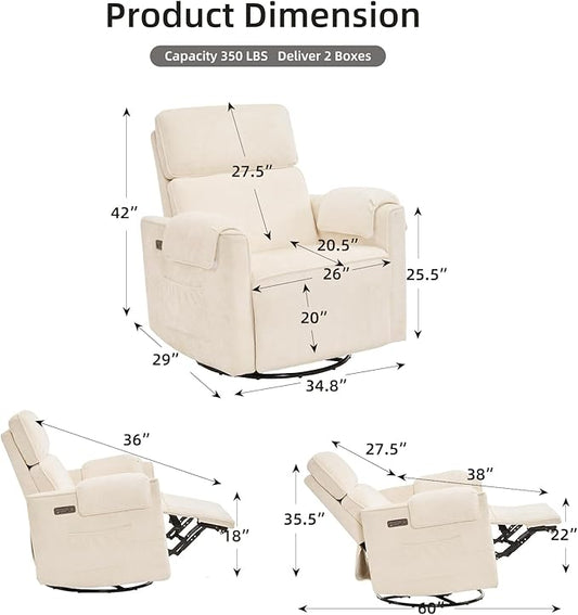 Power Swivel Glider Rocking Recliner Nursery Chair with 2 Pillows, Electric Rocker Reclining Chairs with Type-C & USB Charger Port for Living Room, High Back Barrel Armchair for Bedroom, Beige