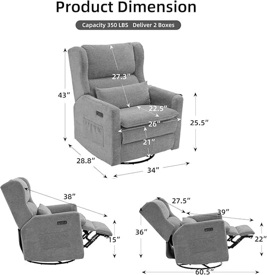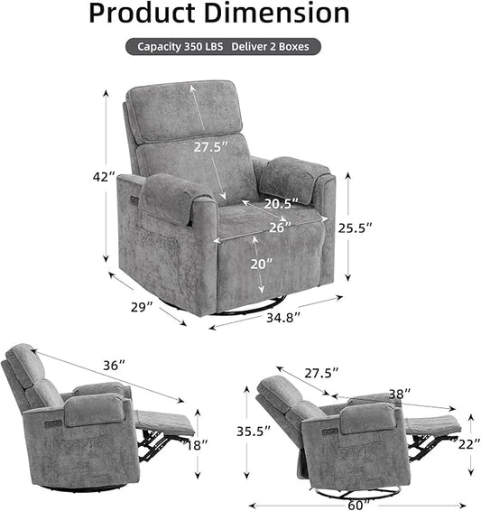 Power Swivel Glider Rocking Recliner Nursery Chair with 2 Pillows, Electric Rocker Reclining Chairs with Type-C & USB Charger Port for Living Room, High Back Barrel Armchair for Bedroom, Grey