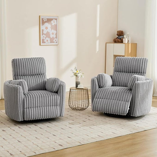 Power Swivel Glider Rocking Recliner Nursery Chair with 2 Pillows, Electric Rocker Reclining Chairs with Type-C & USB Charger Port for Living Room, High Back Barrel Armchair for Bedroom,Corduroy, Grey