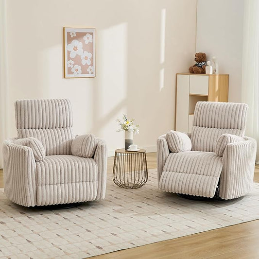 Power Swivel Glider Rocking Recliner Nursery Chair with 2 Pillows, Electric Rocker Reclining Chairs with Type-C & USB Charger Port for Living Room, High Back Barrel Armchair for Bedroom,Corduroy,Beige