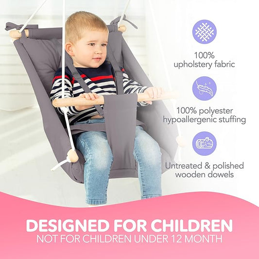 CaTeam Canvas Toddler Swing – Indoor/Outdoor Hanging Chair for Patio & Playroom with Safety Belt – Wooden Baby Seat for Ages 12+ Months – Gray