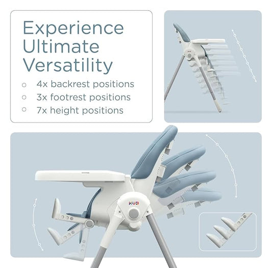KÜB 3-in-1 Foldable Baby High Chair | Multifunctional Infant High Chairs for Babies and Toddlers | Removable Seat & Tray Easy Clean | 7 Height & 4 Recline Adjustable | 2 Locking Wheels (Grey)