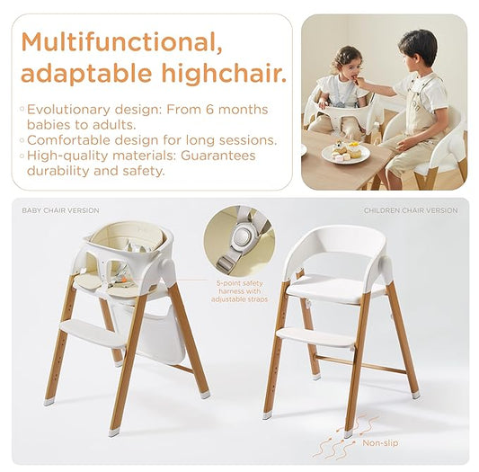 KUB High Chair for Babies and Toddlers Adjustable Foldable Convertible 5 Point Harness Easy Clean Wood-Printed Metal with Removable Tray Baby Highchair for Family (White&Natural Wood-Printed Metal)
