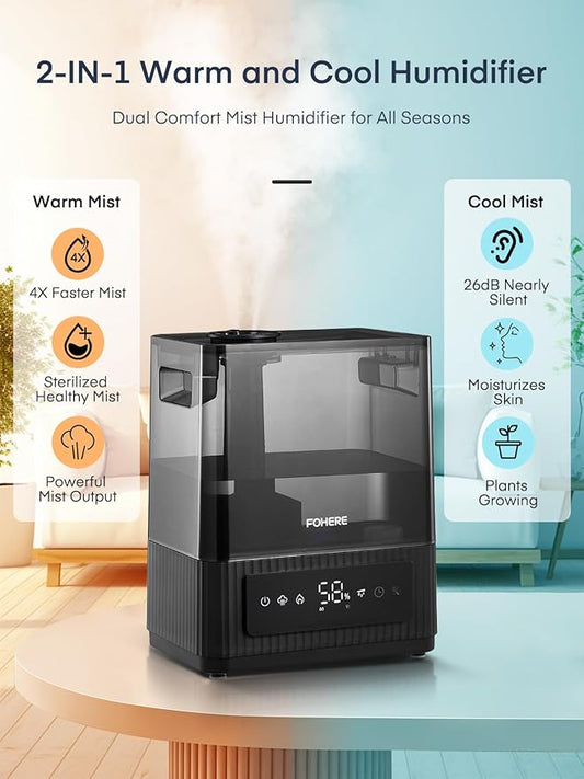 FOHERE Smart Humidifiers for Bedroom, 6L Warm and Cool Mist Quiet Humidifier with 60H Runtime, Humidity Control, Oil Diffuser, Sleep Mode, 12H Timer, Light, Top Fill Ultrasonic for Home Baby Plant