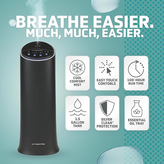 Pure Guardian Ultrasonic Cool Mist Humidifier, 100 Hour Run Time, 1.5 Gallon Tank, 440 Sq. Ft. Coverage, Medium Rooms, Quiet, Filter Free, Black, H3200BAR