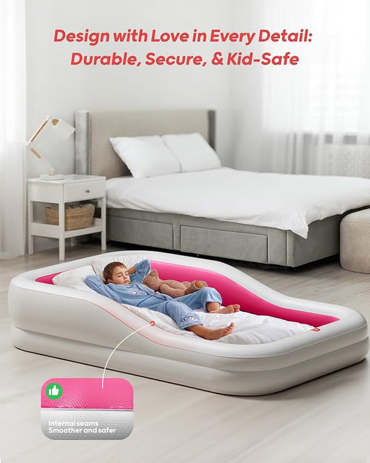 Inflatable Toddler Travel Bed - Blow Up Mattress for Kids with Waterproof Sheet Protector Portable Toddler Bed Baby Air Mattress with 3 Sides, Cozy Kids Air Mattress Set with High-Speed Pump