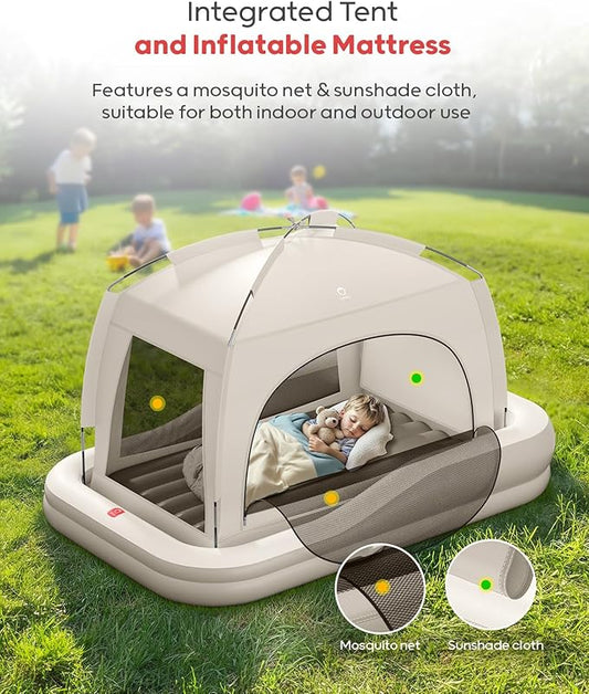 QPAU Inflatable Toddler Travel Bed with Tent, Baby Crib Tent, Portable Kids Air Mattress with Safety Bumpers, Ideal for Home, Grandma's, Camping, Traveling -Includes Fast Electric Pump (Khaki)