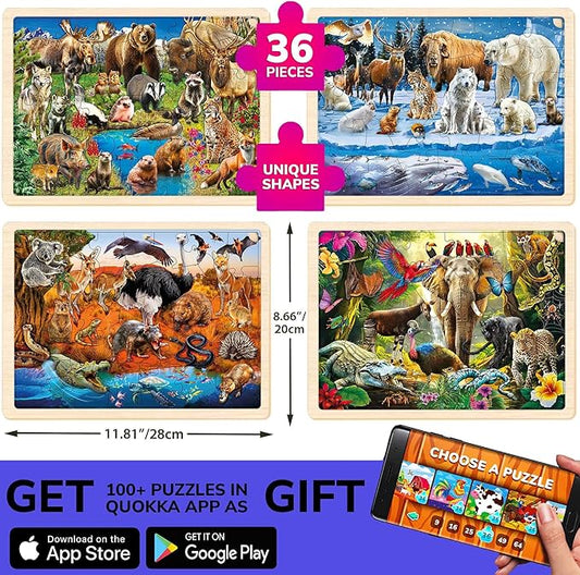 QUOKKA 4SET Puzzles for Kids Ages 4-6 - 36 Pcs Wooden Realistic Montessori Puzzles Ages 3-5 - Polar & Tropical Regions, Yellowstone & Australian Animals Learning Games for Boys and Girls 4-8 Year Old