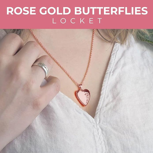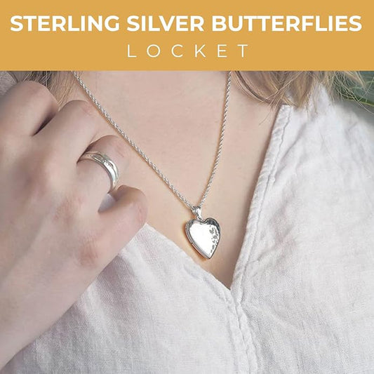 PicturesOnGold.com Personalized Heart Shaped Butterflies Photo Locket Necklace - 3/4 inch x 3/4 inch - Includes 18 inch Chain - Custom Engraved Picture Locket Necklace for Women
