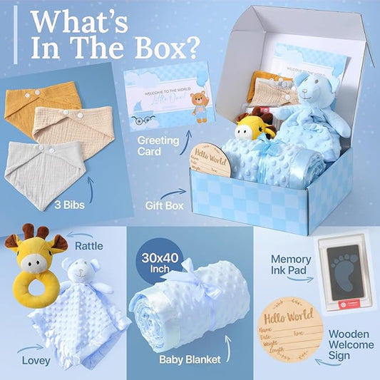 Baby Shower Gifts for Boys - Premium 10-Piece Baby Bundle | Baby Boy Gifts & Baby Gifts for Boys Newborn 0-6 Months | Keepsake Set with Blanket, Bibs, Lovey, Rattle & More