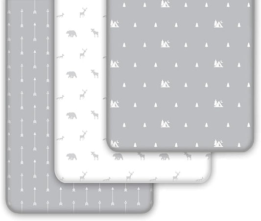 Fitted Unisex Crib Sheets (3 Pack) by GROW WILD - Jersey Knit Cotton Crib Sheets for Boys or Girls, 52” x 28” x 9” Crib Bedding Set (Woodland Gray and White)