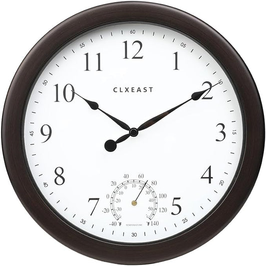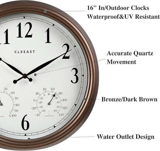 CLXEAST Indoor Outdoor Clocks Waterproof 16 Inch, Large Outdoor Clock Thermometer Combo& Hygrometer,Bronze/Dark Brown Finish,House Warming Gifts New Home
