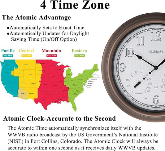 CLXEAST 24 Inch Illuminated in/Outdoor Lighted Atomic Analog Wall Clock with Thermometer & Hygrometer, Oversized Large Waterproof Wall Clocks for Living Room Decor,Bronze Finish