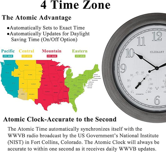 CLXEAST 18 Inch Farmhouse Illuminated Outdoor Atomic Wall Clock with Thermometer & Hygrometer Combo, Night Lighted Wall Clock with Smart Sensor, Weather Stations,Brushed Grey Oak Finish