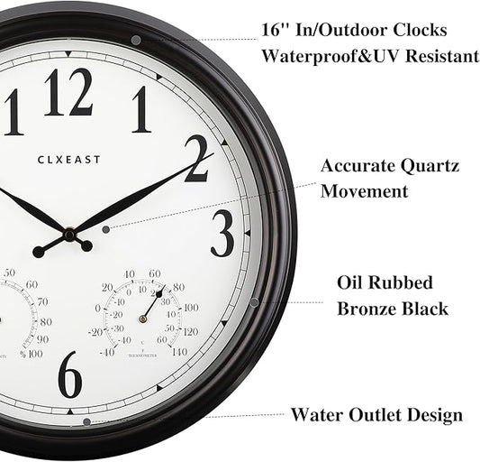 CLXEAST Indoor Outdoor Clocks Waterproof 16 Inch, Large Outdoor Clock with Temperature and Humidity for Patio,Porch,Pool,Oil Rubbed Bronze Black Finish,House Warming Gifts New Home