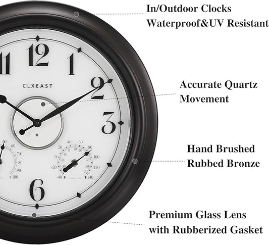 CLXEAST Outdoor Clocks for Patio Large Waterproof with Thermometer,18 inch Outdoor Wall Clock with Temperature and Humidity Combo,Weatherproof,Oil Rubbed Bronze