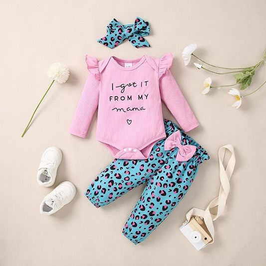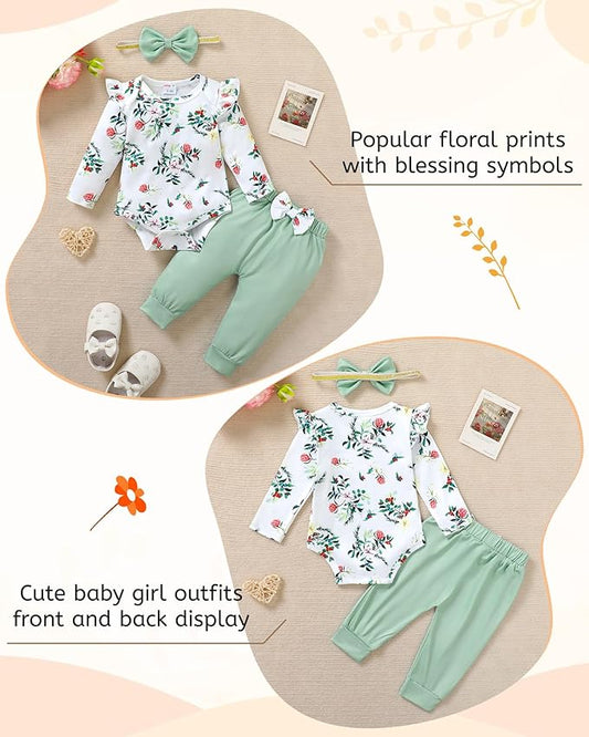 DISAUR Baby Girls Clothes Newborn Infant Baby Girls Outfit Long Sleeve Ruffle Romper Floral Pants Headband Sets 0-18 Months