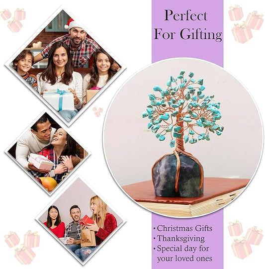 Crocon Howlite Green Turquoise Gemstone Money Tree with Fluorite Rough Wire Wrapped Base | Feng Shui Bonsai | Ornament Figurine | Chakra Balancing | Reiki Crystal Healing | Spiritual | Decor Size 5-6"