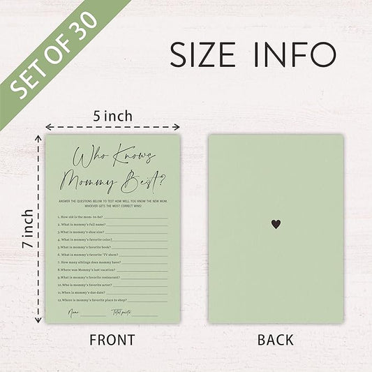 30 Pcs Minimalist Green Shower Game Cards, Who Knows Mommy Best, Games To Play With Family and Friends, Baby Announcement, Gender Reveal Party Supplies - A07