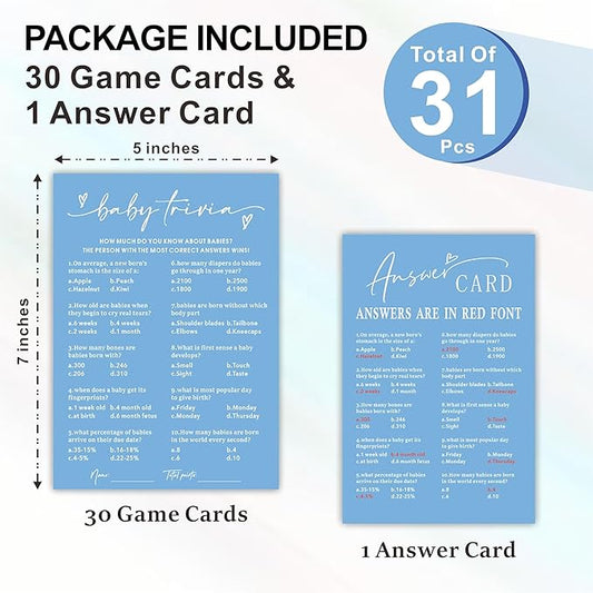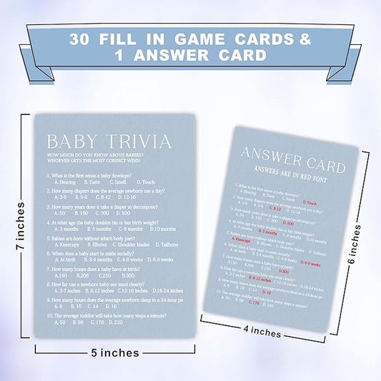 Baby Trivia - Baby Shower Game Cards - Minimalism Blue - 30 Double-Sided Fill In Style Game Cards With Answer Card, Gender Reveal, Baby Announcement, Party Games & Activity - C13