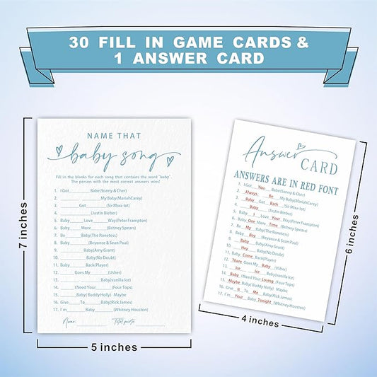 Name That Baby Song Game Set For Baby Shower - Minimalism White & Blue - 30 Double-Sided Fill In Style Game Cards & 1 Answer Card For Gender Reveal, Baby Announcement, Party Favor & Supplies - C04