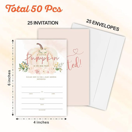 A Sweet Pumpkin Is On Her Way Baby Shower Invitation, Set Of 25 Boho Pumpkin Invites With Envelopes For Baby Girl, Gender Reveal, Baby Announcement Party, Party Favor & Supplies - C03