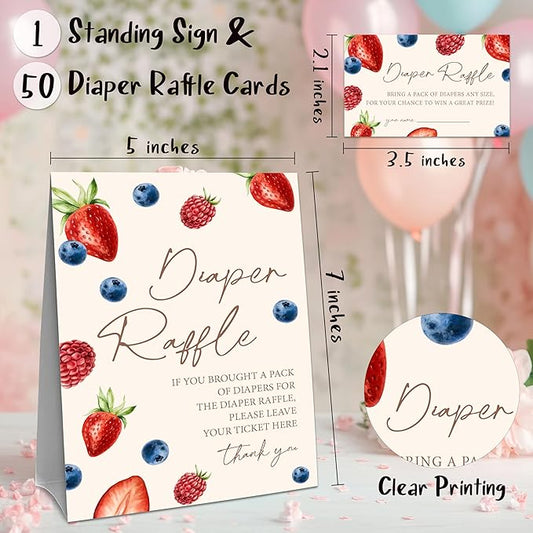 Blueberry & Strawberry Diaper Raffle Set For Baby Shower - 50 Raffle Tickets With 1 Standing Sign - Baby Announcement, Gender Reveal Baby Shower Party Decoration Game Set - A06