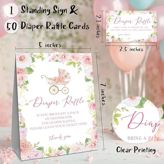Floral Stroller Diaper Raffle Set For Baby Shower - 50 Raffle Tickets With 1 Standing Sign - Baby Announcement, Gender Reveal Baby Shower Party Decoration Game Set - A05