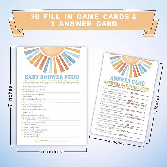 Retro Sunshine Baby Shower Feud Game Kit - Here Comes The Sun - 30 Double-Sided Game Cards & 1 Answer Card For Baby Shower, Gender Reveal Party Favor, Activity & Supplies - A06