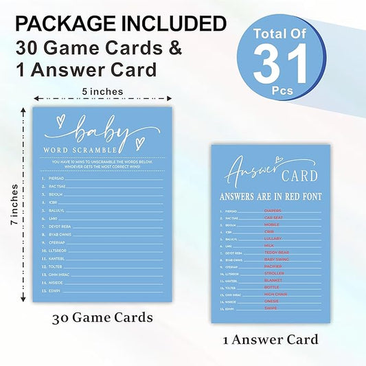 Baby Word Scramble Baby Shower Game Cards - Minimalism Blue - 30 Double-Sided Fill In Style Game Cards With Answer Card, Gender Reveal, Baby Announcement, Party Games & Activity - C14