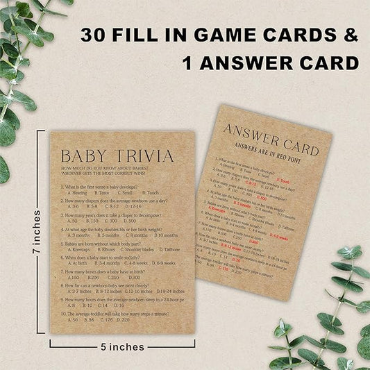 Baby Shower Game Card - Set Of 30 Kraft Paper Double Print - Baby Trivia Game Cards With 1 Answer Card For Baby Boy Girl, Baby Announcements, Gender Reveal Games, Party Favors And Supplies-B10