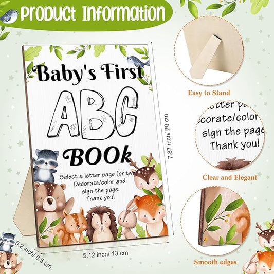 Geelin 51 Pcs Fun Baby Shower Game Activities First Abc Book Sign Coloring Game Card 26 Alphabet a to Z Coloring Card with 24 Watercolor Pen Storage Bag for Baby Shower Party(Woodland)