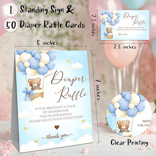Blue Teddy Bear Diaper Raffle Set For Baby Shower - 50 Raffle Tickets With 1 Standing Sign - Baby Announcement, Gender Reveal Baby Shower Party Decoration Game Set - A01