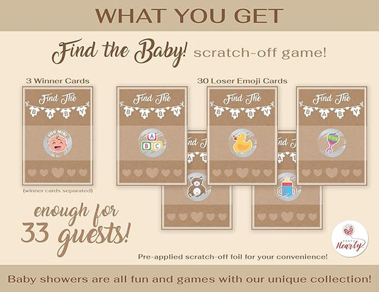 Party Hearty Baby Shower Games Kraft 33 Raffle Cards, Emoji Scratch Off Lottery Tickets, 3 Winners 5 Different Loser Card Designs, Gender Neutral, Silly Activity for Ice Breakers, Door Prizes, Favors
