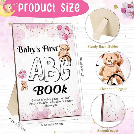 Geelin 51 Pcs Fun Baby Shower Game Activities First Abc Book Sign Coloring Game Card 26 Alphabet a to Z Coloring Card with 24 Watercolor Pen Storage Bag for Baby Shower Party(Pink Bear)