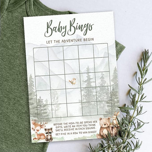 Printed Party Woodland Baby Shower Games for Boy – Set of 4 Games for 30 Guests, Forest Animal Theme, Includes Bingo, Mommy Trivia, Emoji Storybook, and Guess Who