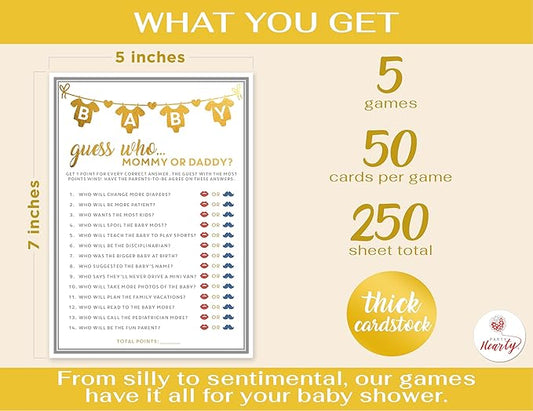 Party Hearty Baby Shower Games for Girl or Boy, 250 pcs 5 Games Activities Cards, Funny Baby Shower Games, Gender Neutral, Baby Shower Ideas