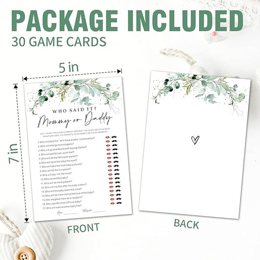 Baby Shower Game Cards - Set of 30 Mommy Or Daddy Game - Greenery Double Sided Print Baby Announcement Gender Reveal Card for Parents to Be - Baby Shower Party Activities Supplies - A11