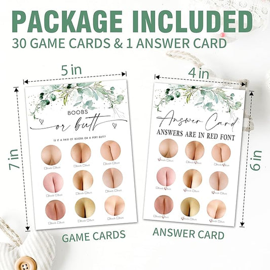 Greenery Baby Shower Game Cards - Set of 30 Boobs Or Butt - Double Sided Print Baby Announcement Gender Reveal Game Card For Parents To Be - Baby Shower Party Activities Supplies - A10